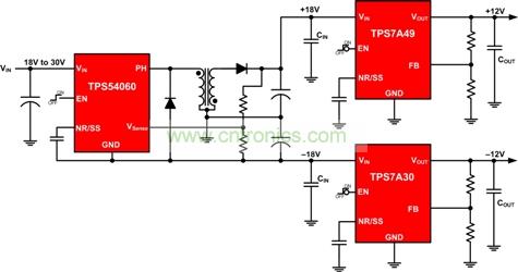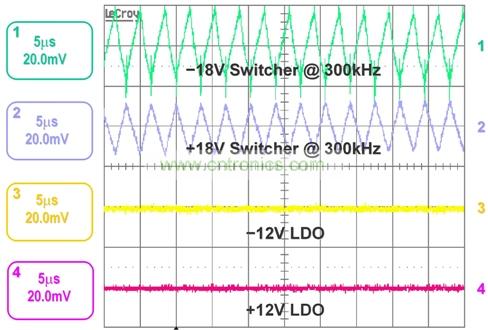 要創建這種參考設計,需使用一個降-升壓結構的 +60V 開關轉換器來產生一個平衡的+/-輸出電壓。利用低噪聲、高 PSRR LDO(例如:TPS7A30 和 TPS7A49 等),對開關的正負電壓輸出進行后期穩壓。圖 2 中,–18V 軌的開關穩壓器電壓紋波為約 40mV,而 +18V 軌則為 20mV。通過使用 LDO 對 300 kHz 開關穩壓器的輸出進行后期穩壓,電壓紋波得到極大減弱。這里,我們使用 60V 開關轉換器,因為接地引腳參考至 –18V 軌,并且最大 VIN為 30V。在這種配置中,開關轉換器必須承受的最大電壓為 48V。請為其寬輸入電壓、低輸出噪聲和高 PSRR 選擇 LDO。