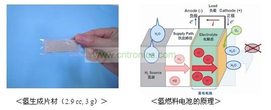 此次開發(fā)的氫燃料電池,使用了加水即可產(chǎn)生氫的固體,可利用水的合成進(jìn)行發(fā)電,因此,發(fā)電時(shí)的生成物僅僅是水(水蒸氣),不會(huì)產(chǎn)生二氧化碳和有害物質(zhì)(揮發(fā)性有機(jī)化合物:VOC)。廢棄時(shí)亦可作為一般垃圾處理,是極為環(huán)保的燃料電池。