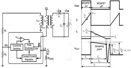 表示,由此可知,在去磁結束時間點,次級繞組輸出電壓與輔助繞組具有線性關系,只要采樣此點的輔助繞組的電壓,并形成由精確參考電壓箝位的誤差放大器的環路反饋,就可以穩定輸出電壓VO。這時的輸出電流IO由公式