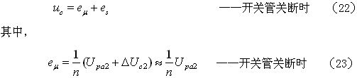 值得注意的是,當電源開關管Q1關斷時,由于變壓器次級線圈整流濾波電路D2和C2的接入,開關變壓器初、次級線圈的等效分布電容Cs相對于濾波電容C2來說,其作用將變得微不足道;此時,由于輸出電壓Uo通過變壓器初、次級線圈的耦合和反射作用,使得變壓器初級線圈產生的反電動勢電壓完全被鉗制在一個與次級輸出電壓Uo成正比的數值上,即: