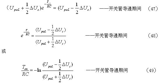 (48)和(49)式就是我們用來計算RCD尖峰脈沖吸收電路參數,電阻R、電容器C的容量、電容吸收尖峰脈沖的電壓增量、以及開關變壓器初級線圈反激輸出電壓的半波平均值