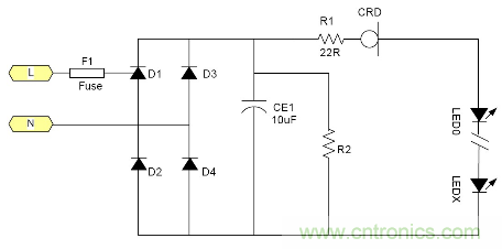 由于恒流二極管需要一定的電壓Vk才能夠進入恒流, 所以太低的電源電壓是無法工作的。通常這個Vk大約在5-10V左右 所以大多數(shù)采用電池供電的LED是無法工作的, 最大電流由于恒流二極管的功耗受到限制, 所以過大的電流也是不合適的。例如1W的LED通常需要350mA, 恒流二極管就很難提供, 目前比較合適的使用場合就是交流市電供電的LED燈具采用很多小功率LED串聯(lián)也就是高壓小電流的情況是最為合適;但是由于恒流二極管的耐壓有一定的限制 所以它所能吸收的電源電壓變化也是有限的。就拿100V耐壓的CRD來說用在220V市電電源里都還只能對付有限的電壓變化。220V經(jīng)過橋式整流以后它的輸出直流電壓大約為264V.如果市電變化+10% ~-15%就相當于整流后為290~187V, 電壓變化103V.已經(jīng)超過其耐壓了。因為LED伏安特性的非線性 所以很難用公式來表示。總之當市電電壓降低時LED中的電流就會隨市電電壓的降低而降低。其亮度也會跟著變。 典型應用電路中圖3為典型的應用電路, 圖4為加了阻容降壓的應用電路為了應對低電壓的輸出場合。