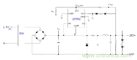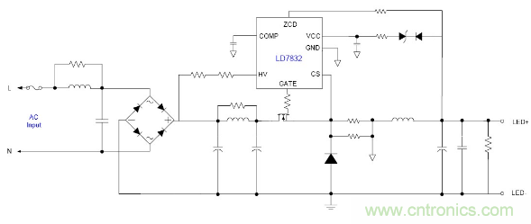 隨著目前法規(guī)和能效的需求, 針對LED應用提出高PF以及適應全電壓范圍都能可靠工作的要求, 并且朝小型化方面發(fā)展, 因此之前的填谷式的PFC電路也需要增加兩個高壓電容因體積的限制不太適合應用。有鑒如此, 國內外很多廠商都推出了適應球泡燈和T管之類的非隔離電源應用驅動方案, 下面就以通嘉科技的LD7832做為典型介紹。