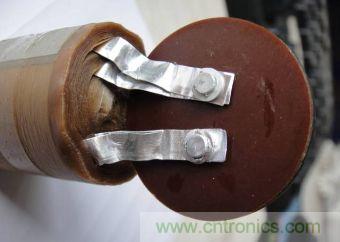 去掉固定的電子膠帶,就可以拆開內部的鋁箔卷了。拆開后可以看紙張的材質是否均勻,鋁箔是否有明顯的劃痕黑斑等。打開到引線的時候,可以看看刺鉚的是否牢靠,大型的引線可能會有很多對,那是增加輸出電流降低內阻用的。大型的電解引條是純鋁條,多半是用超聲波壓接的方式,看不到小孔,但是連接的更牢靠。
