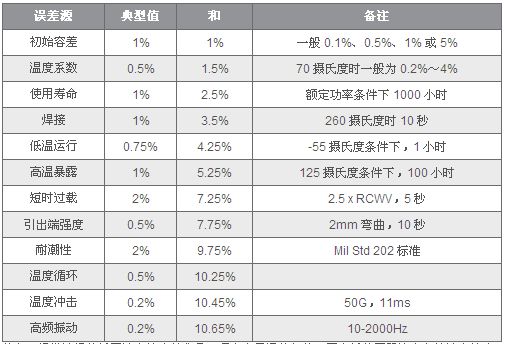 有趣的是,這樣給低壓輸出帶來了更高的精度。許多IC參考電壓范圍為0.6~1.25 V之間,輸出電壓降至這一范圍時會帶來1%或更高的精度。表1給出了您可能需要了解的一些信息,這些信息是典型電阻器產品說明書的電阻誤差術語匯編。在設計中,該列表會較難理解。大多數工程師都止步于初始容差,然而列表中還有一些或許不應被忽略的誤差項。表格中的每一項都有其微妙的影響。例如,沒有指定具體的溫度系數范圍,而實際上兩個電阻都可能隨溫度變化以相同方向變化,并且不會在相反的極端。在對一些經驗豐富的設計工程師進行簡單調查后,得出的結論是假設1%容差電阻的2.5%精度可在極端情況和合理成本之間得到一個合理的折中方案。