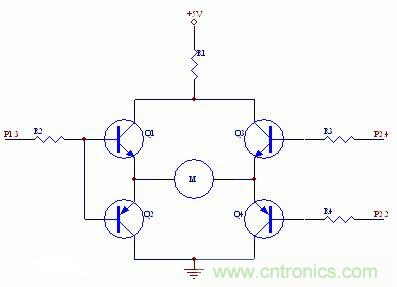 如下圖所示,些電路是作者最初設計的電路,P1.3、P2.2和P2.4分別是51單片機的IO引腳。設計的工作原理是:當P1.3高電平、P2.2和P2.4都為低電平時,電機正轉。此時,Q1和Q4導通,Q2和Q3截止,電流注向為+5VàR1àQ1àMàQ4;當P1.3低電平、P2.2和P2.4都為高電平時,電機反轉。此時,Q2和Q3導通,Q1和Q4截止。P2.2為高電平同時P2.4為低電平時,電路全不通,電機停止。圖中電阻:R1=20Ω,R2=R3=R4=510Ω