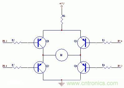 這個電路可以使電機運行,但在R2的選擇上,比較講究,因為R2的上拉作用不但對Q1有影響,而且對Q2的導通也有影響。如果R2選的過小,則雖然對Q1的導通有利,但對Q2的導通卻起到抵制作用,因為R2越小,上拉作用越強,Q2的導通是要P1.3電位越低越好,所以這是矛盾的。也就是說,Q1的導通條件和Q2的導通條件是矛盾的。