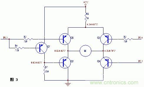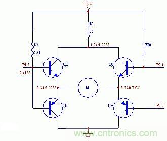 但實際實驗情況去出人意料,即電機正向和反向都不轉。經測量,當P1.3高電平,P2.2和P2.4都為低電平時,Q4導通,但Q1不導通,P1.3的電平只有0.67V左右,這樣Q1無法導通。