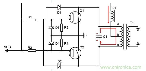 7. (圖3)由于T1對C1的持續充電,C1上電壓為a正c負,通過兩個二極管使Q2柵極電壓升高,Q1柵極逐漸下降,同時正反饋形成,Q2導通,Q1截止。