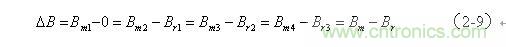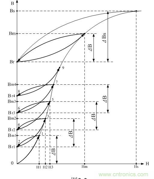 同理,當?shù)诙€直流脈沖加到變壓器初級線圈a、b兩端時,變壓器鐵芯中的磁感應強度B將按圖2-2中新的磁化曲線2-3上升,磁感應強度被磁場強度磁化到第二個最大值Bm2,使磁感應強度產生一個增量ΔB, 。