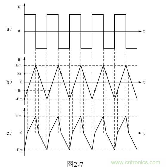 從圖2-7-a)和圖2-7-b)可以看出,每輸入一個(gè)交流脈沖電壓,變壓器鐵芯中的磁感應(yīng)強(qiáng)度B或磁通就要線性增長(zhǎng)和下降一次,磁感應(yīng)強(qiáng)度變化的范圍是從負(fù)的最大值-Bm到正的最大值Bm,并且增長(zhǎng)和下降的速率基本一樣。