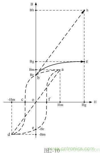 在圖2-10中,虛線表示的磁化曲線a-b-c-d-e-f-a為雙激開關(guān)變壓器鐵芯正常工作時(shí)的磁滯回線,虛線線段d-a是把開關(guān)變壓器鐵芯的磁化曲線理想化后得到的一條曲線(直線),理想磁化曲線是一條斜率等于最大磁感應(yīng)強(qiáng)度增量與最大磁場強(qiáng)度增量之比,且經(jīng)過坐標(biāo)原點(diǎn)的直線;當(dāng)直線不經(jīng)過坐標(biāo)原點(diǎn)時(shí),這條直線可稱為等效磁化曲線(如線段bh)。理想磁化曲線只有一條,但等效磁化曲線卻有無數(shù)多條,且每條效磁化曲線均與理想磁化曲線平行。