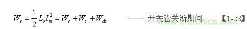 【1-28】式中,Wc 為電源開關(guān)管由導(dǎo)通到完全關(guān)斷期間電容器C儲(chǔ)存的能量, Wr為電源開關(guān)管由導(dǎo)通到完全關(guān)斷期間電阻R損耗的能量,Wds 為電源開關(guān)管由導(dǎo)通到完全關(guān)斷期間漏極電流(逐步減小)對(duì)電容器C充電產(chǎn)生分流作用所做的功。