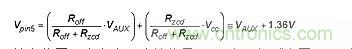然后,施加在引腳5上的電壓就為偏置。事實上,這就像是VAUX電壓與減小了1.36V的ZCD閾值比較。這樣一來,新的實際ZCD閾值就是: