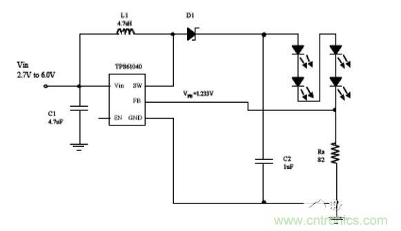 圖 中的升壓轉換器被配置為一個可驅動 4白光 LED 的電流源。該器件將檢測電阻器 Rs 兩端的電壓調節至 1.233V,從而得到一個定義的 LED 電流。
