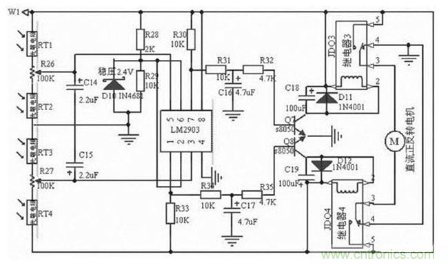 控制器的輸入端,光敏傳感器分別由兩只光敏電阻串聯(lián)交叉組合而成。每一組兩只光敏電阻中的一只為比較器的上偏置電阻,另一只為下偏置電阻。一只檢測(cè)太陽(yáng)光照,另一只則檢測(cè)環(huán)境光照,送至比較器輸入端的比較電平始終為兩者光照之差。具體電路如圖4 所示:光敏電阻RT1 , RT2 與電位器R27 和光敏電阻RT3 , RT4 與電位器R28 分別構(gòu)成光敏傳感電路。將RT1 和RT3 安裝在垂直遮陽(yáng)板的一側(cè), RT4 和RT2 安裝在另一側(cè)。當(dāng)RT1 , RT2 , RT3 和RT4 同時(shí)受環(huán)境自然光線作用時(shí),R27 和R28 的中心點(diǎn)電壓不變。當(dāng)只有RT1 ,RT3 受太陽(yáng)光照射, RT1 的內(nèi)阻減小, LM 2903 的5 腳電位升高, 7 腳輸出高電平, 三極管Q7 導(dǎo)通,JDQ 4 工作,其觸點(diǎn)3, 5 閉合。同時(shí)RT3 內(nèi)阻減小, LM 2903 的3 腳電位下降, JDQ 5 不工作,電機(jī)M 正轉(zhuǎn);當(dāng)只有RT2 , RT4受太陽(yáng)光照射,同理,電機(jī)M 反轉(zhuǎn)。當(dāng)轉(zhuǎn)到垂直遮陽(yáng)板兩側(cè)的光照度相同時(shí),JDQ 4, JDQ 5 都導(dǎo)通,電機(jī)M 才停轉(zhuǎn)。在太陽(yáng)不停地偏移過(guò)程中,垂直遮陽(yáng)板兩側(cè)光照度的強(qiáng)弱不斷地交替變化,電機(jī)不停的運(yùn)動(dòng),使太陽(yáng)能接收裝置始終面朝太陽(yáng)。