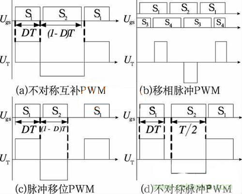 下面我們來具體說一下控制型軟開關PWM控制策略,它是指控制型軟開關半橋DC/DC變換器不增加主電路元器件(可增加電感電容元件以實現軟開關條件),通過合理設計控制電路來實現軟開關。圖2給出4種控制型軟開關半橋DC/DC變換器的PWM控制策略。