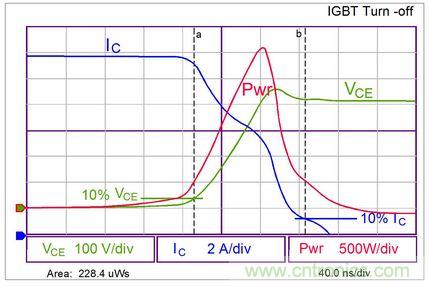 導通時,應當量測起于IC電平10%終于10% VCE點的損耗。這些電平等級相當標準,雖然這樣說也有些主觀性。如果需要的話,也可以使用其他點。無論選擇何種電平來量測不同間隔,重要的是保持一致,使從不同 組件獲取的數據能夠根據相同的條件來比較。功率根據示波器波形來計算。由于它并非恒定不變,且要求平均功率,就必須計算電源波形的積分,如波形跡線的底部 所示,本案例中為674.3 μW(或焦耳)。