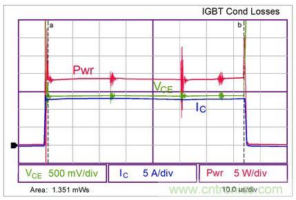 導電損耗的量測方式類似。它們應當起于導通損耗終點,終于關閉損耗起點。這可能難于精確量測,因為導電損耗的時間刻度遠大于開關損耗。