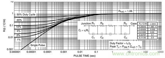 安森美半導體IGBT組件的數據表中包含IGBT及二極管θ值圖表。穩態θ值如圖7及圖8中的圖表所示。IGBT的θ值為0.470 °C/W,二極管為1.06 °C/W。計算中還要求另一項熱系數,即兩個裸片之間的熱交互影響常數ψ。測試顯示對于TO-247、TO-220及類似封裝而言,此常數約為0.15 °C/W,下面的示例中將使用此常數。