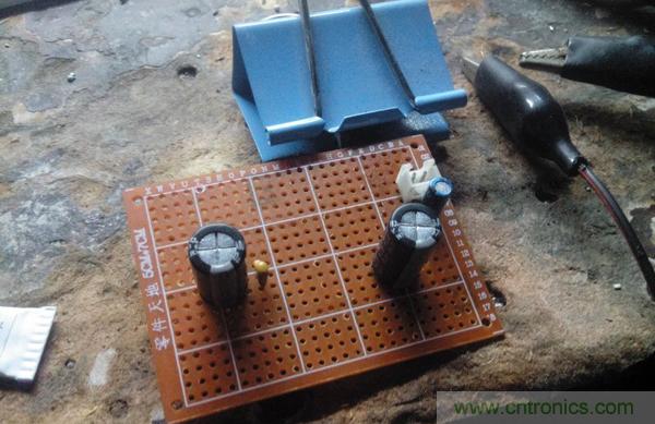 輸入輸出濾波電容以及穩壓塊輸出插座焊接好,也有一只220uF的小電容做濾波,藍色燕尾夾是固定穩壓塊和散熱片,用的導熱膠粘上去,發現要是完全固化了,摳都摳不下來。