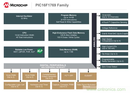 PIC16F1769系列集成了多個(gè)智能模擬和數(shù)字外設(shè),包括三態(tài)