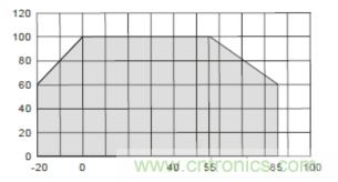 目前,大多數常規電解電容的額定工作溫度為105℃,但因電解電容在高溫條件下電解液易揮發,電源本身發熱較大等原因,常規采用電解電容的AC-DC電源只能工作在70℃的環境條件下。要提高電源的工作環境溫度,必須采用價格更昂貴、體積更大的電解電容,或者以降額的方式實現高低溫條件下的應用,下面以金升陽常規AC-DC電源產品在高低溫環境下的降額要求如圖3: