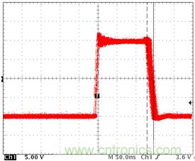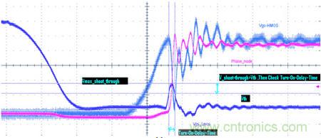 測試的目的是看上MOS管導通時,有沒有同時把下管打開,從而導致電源直接導通到地而引起短路。如圖三所示藍色曲線(Vgs_Lmos)就是下管在上管導通的同時,被帶了起來,如果藍色曲線的被帶起來的尖峰超過了MOS管的Vth要求,同時持續時間(Duration)也超過了datasheet要求,從而就會有同時導通的風險。當然,這是大家最常見到的情況。