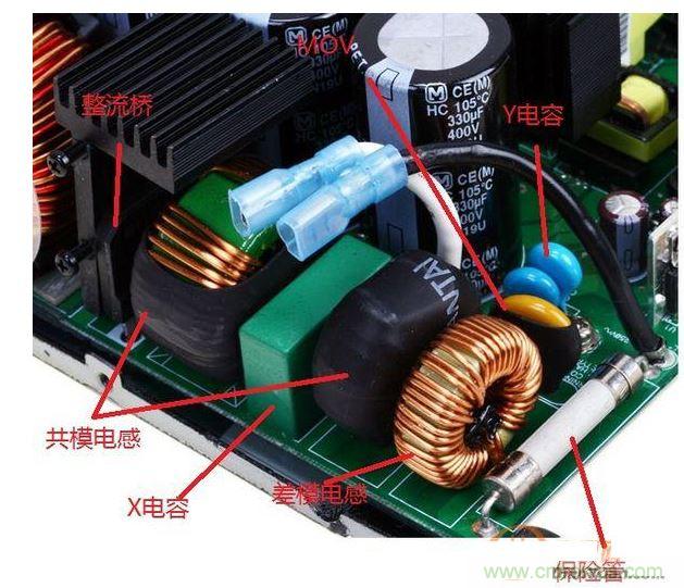 從圖3可以看到X電容、Y電容、共模電感、差模電感、保險管、MOV。他們的分工如下: