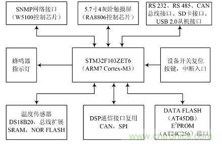 人機交互控制模塊是此IPS 設計中最為復雜的數字化管理模塊, 它不僅監測和管理逆變系統的運作, 還要保證IPS 控制器與外界的通信。設計中要求人機交互模塊能處理復雜的任務調度和很強的突發訪問( 中斷) 處理, 這就必須有較高運行速度;模塊內部還要有豐富的擴展接口提供IPS 與外部即時通信; 具備優越的總線控制和訪問機制等。綜合考慮上述需求, 設計中選擇了意法半導體( ST ) 公司推出的最新32 位單片機STM32F103ZET6 ( 以下簡稱ST M32) 。ST M32 是基于ARM7 Co rtexM3 內核架構的高速高性能嵌入式控制芯片, 擁有72 MHz 內核工作頻率和1. 25 DMIPS/ MHz的指令流水處理速度; 先進的總線結構和多達16 級的帶DMA 功能搶占中斷機制( NIVC) [ 10] 。如圖3 所示,設計中ST M32 通過SCI 接口及1 根中斷請求/ 接收線與DSP 2808 進行通信; 利用片上擴展的其中2 個SCI 口分別作為RS 232 和RS 485通信協議口; CAN 總線接口和U SB 總線通過共享數據緩沖區和中斷向量入口與外界互聯通信;通過STM32 的26 位地址總線和16 數據總線擴展外掛256 KB SRAM 和4 MB N OR FLASH, 以及8 位數據口的LCM 模塊RA8806 以及用于SNMP 的16 位并行數據的以太網芯片W5100; 啟用ST M32 的SDIO 總線以啟用用戶插入SD 卡存儲查詢IPS 狀態數據功能; 啟用現場環境下獨立時鐘看門狗電路和STM32 特有的窗口看門狗;啟用內部芯片溫度傳感器采樣監控, RC時鐘源以及外部喚醒功能; 通過通用引腳接入DS18B20 溫度傳感器對環境溫度的采樣, 預留I2 C 方式E2PROM 和SPI 方式的DA TA FLASH 接口為產品后續升級開發做準備。
