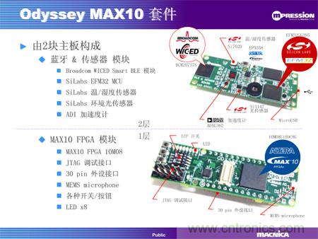 “Odyssey”開發套件是為物聯網應用而設計的開發與評估套件,用戶可在iOS和Andriod手機上安裝專用應用程序,直接通過藍牙接口讀寫分析數據以及遠程控制。該開發套件由一塊MAX 10 FPGA板卡和一塊藍牙及傳感器板卡組成。