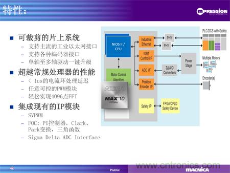 同期推出的還有駿龍科技基于MAX® 10 FPGA的電機驅動方案,通過FPGA實現馬達控制的算法核心,提供了高性能、定制化和單芯片的解決方案,為馬達控制帶來革命性的質的飛躍。使用FPGA 替代傳統的CPU/DSP架構實現算法,意味著所有的算法都將通過硬件實現,這樣由于處理能力限制而在CPU中無法實現的算法,現在都可以在MAX® 10 FPGA中以輕松地實現。Altera的MAX 10支持EtherCAT、Powerlink、Mechatrolink等工業以太網接口以及Endat 2.2, BISS等編碼器接口,用戶可以該方案中實現靈活可定制的接口。該方案還提供可定制的調試界面,客戶可以根據自己的需求,定制自己的調試界面,實時觀測內部信號。