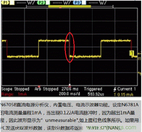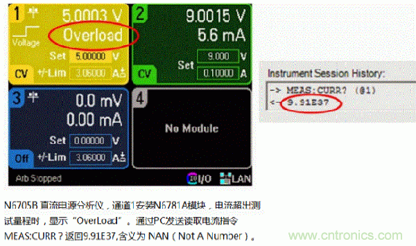 設定N6781A源表模塊的電流量程1mA,然后控制輸出電流超過1mA。此時,顯示屏上直接顯示“OverLoad”,而不是電流的數值。如果通過PC發送讀取電流指令,你會讀到9.91E37,這個數值9.91E37在SCPI(儀表編程命令標準)中被定義為“NAN”(Not A Number)。所有是德科技的測試儀表都是遵循SCPI標準的,當實際值超出量程時,電源返回9.91E37。NAN(9.91E37)實際代表一個32bit浮點數,在所有測量儀表中預計都不會出現這么大的數值。