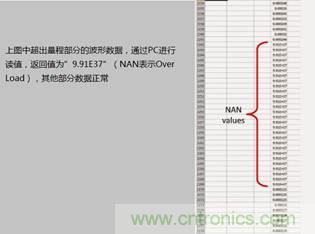 通過PC讀取波形的數據,超出量程部分將返回”9.91E37”,如下圖所示: