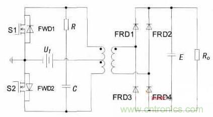 當(dāng)S1開通時,其漏源電壓uDS1只是一個開關(guān)管的導(dǎo)通壓降,在理想情況下可假定uDS1=0,而此時由于在繞組中會產(chǎn)生一個感應(yīng)電壓,并且根據(jù)變壓器初級繞組的同名端關(guān)系,該感應(yīng)電壓也會疊加到關(guān)斷的S2上,從而使S2在關(guān)斷時承受的電壓是輸入電壓與感應(yīng)電壓之和約為2UI.在實際中,變壓器的漏感會產(chǎn)生很大的尖峰電壓加在S2兩端,從而引起大的關(guān)斷損耗,變換器的效率因受變壓器漏感的限制,不是很高。在S1和S2的漏極之間接上RC緩沖電路,也稱為吸收電路,用來抑制尖峰電壓的產(chǎn)生。并且為了給能量回饋提供反饋回路,在S1和S2兩端都反并聯(lián)上續(xù)流二極管FWD.