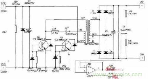 以CA3524芯片為核心,構(gòu)成控制電路。通過調(diào)節(jié)6、7管腳間的電阻和電容值來調(diào)節(jié)全控型開關(guān)器件的開關(guān)頻率。12、13管腳輸出PWM脈沖信號,并通過驅(qū)動電路,分別交替控制兩個全控型開關(guān)器件。電壓反饋信號輸入芯片的1管腳,通過調(diào)節(jié)電位器P2給2管腳輸入電壓反饋信號的參考電壓,并與9管腳COM端連同CA3524內(nèi)部運放一起構(gòu)成PI調(diào)節(jié)器,調(diào)節(jié)PWM脈沖占空比,以達到穩(wěn)定輸出電壓220V的目的。