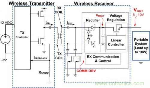 圖1中顯示的是一張緊密耦合智能無線電源系統的簡化圖。如果從原理圖的角度來看,它看起來很像一款變壓器耦合隔離式電源轉換電路。然而在這里,初級線圈和次級線圈是完全分離開來,而不是繞在同一磁芯上的。電能從發射器(初級,或TX)端傳輸到接收器(次級,或RX)端,而接收器電路以數字脈沖的形式將反饋發送回磁耦合器件。