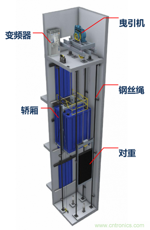 傳統(tǒng)電梯的動力部分主要由曳引機(卷揚機)、變頻器、轎廂、鋼絲繩、對重組成。曳引機通過卷動鋼絲繩,調(diào)節(jié)轎廂和對重的平衡,實現(xiàn)對轎廂高度的控制,即電梯的上下。其中曳引機本質(zhì)就是一臺由變頻器驅動與控制的大功率電機,需要安置在大樓頂層——這就造成了電梯無法上頂層的問題了,因為頂層的電梯位置被曳引機和變頻器占據(jù)了。這問題一直存在了很久的時間,因為過去曳引機基本都用交流異步電機,且功率輕松上幾十KW,體積非常大,且不能露天放置,只能一直占著頂樓的房間。