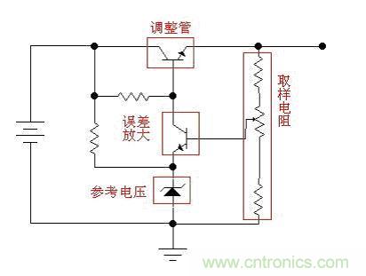 讓我們繼續:如果我們用一個三極管或者場效應管,來代替圖中的可變阻器,并通過檢測輸出電壓的大小,來控制這個“變阻器”阻值的大小,使輸出電壓保持恒定,這樣我們就實現了穩壓的目的。這個三極管或者場效應管是用來調整電壓輸出大小的,所以叫做調整管。
