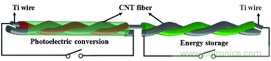 太陽能電池和超級電容器一體集成纖維狀器件示意圖