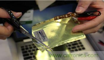 用剪刀減掉電池一角后,仍然能夠安全、正常工作的柔性全固態電池