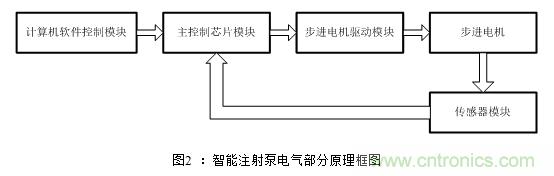 上圖1為最常見的單通道注射泵方案框圖,大體上可以分為軟件系統、機械系統和電氣系統。而詳細的劃分又可以將其劃分為:主控系統、電源系統、電機驅動系統、壓力檢測系統、自動報警系統。最基礎的工作原理為:控制部件通過控制步進電機來推動機械部件的操作,同時會有專門的傳感器模塊實時的檢測實際情況并反饋給控制部件。簡單講,注射泵的電氣部分的工作原理如下圖2: