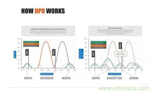 雖然發(fā)動機制動設(shè)計效果顯著,但是增加的車輛總重、車輛較低的滾動阻力和低排量發(fā)動機都要求更強的輔助制動功率,Jacobs的解決方案是高功率密度HPD 發(fā)動機制動系統(tǒng)。在高功率密度發(fā)動機制系統(tǒng)中,橋接器、控制閥和液壓執(zhí)行機構(gòu)都與常規(guī)裝置系統(tǒng),共同應(yīng)用到進氣凸輪。驅(qū)動階段發(fā)動機保持四沖程模式,制動 階段發(fā)動機切換到兩沖程模式,從而制動沖程的數(shù)量加倍。Jacobs解決方案能夠更高效地利用渦輪增壓器,控制其最優(yōu)化制動充壓效果。