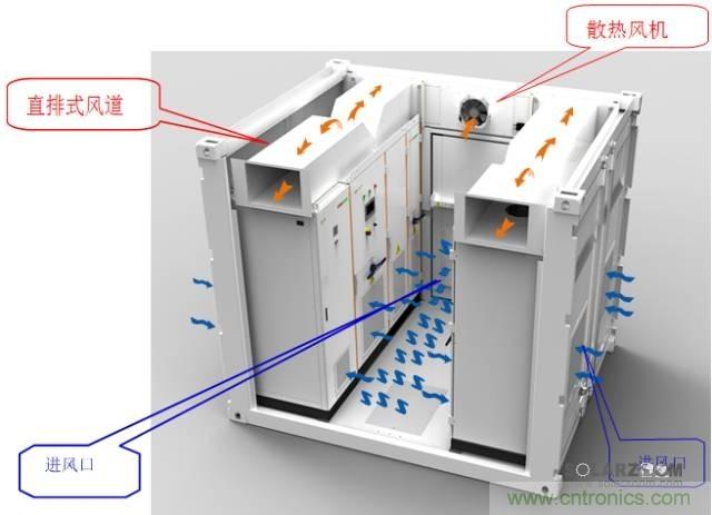 陽光電源箱式逆變房將逆變器、直流柜、通訊單元集成于一體,采用簡潔的分段直排式風道,風道內不含風機,零損耗,免維護。風道長度僅1m,壓力損失小,風機處于最佳效率狀態。逆變器在工作時,大部分熱量通過風道排出集裝箱外,僅有少量熱量通過輻射傳到箱體內部,內部空氣吸收熱量后向頂部流動,再由集裝箱頂部排風扇排出,確保了逆變器的長期可靠運行。
