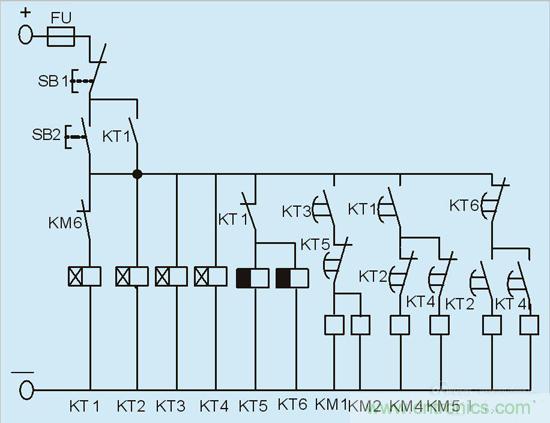 圖3中:X0、X1為輸入繼電器;Y1、Y2、Y3、Y4、Y5、Y6為輸出繼電器;T1、T2、T3、T4為通電延時時間繼電器;T5、T6為斷電延時時間繼電器;M0、M1、M2、M3、M4為中間繼電器。