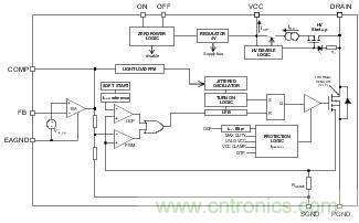 在外部電源模式下,通過連接變壓器輔助繞組或者輸出端(后者只有在非隔離型拓撲情況下),可使VCC電壓保持在4.25V以上,高壓電流發(fā)生器始終處于關(guān)閉狀態(tài)。