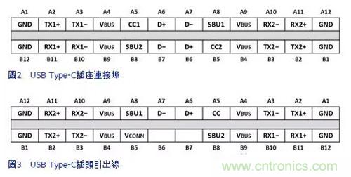 連接埠與連接線的配置如圖2、圖3所示。由于插座連接埠中的訊號採用對稱設計,因此翻轉插頭并不會造成任何問題。USB 3.1 SuperSpeed TX/RX、VBUS、GND以及所有其他引腳會正確連接,不必考慮方向性。從使用者角度來看,因為Type-C連接線可以任一方向插入,因此是Type-A連接埠的升級版。