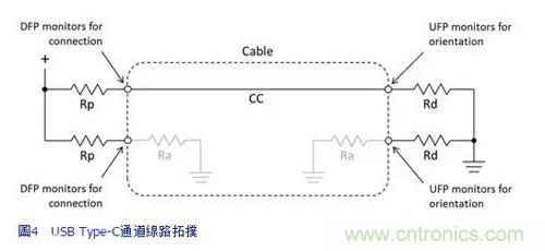 連接裝置之間的初始電力傳輸協議是透過一系列電阻器執行,當Type-C插頭插入插座時,這些電阻器充當CC線路上的分壓器。由于插頭中的CC線路會連接至插座中的CC1或CC2,因此插座只要測量CC1和CC2線路上的電壓,即可判定插頭的方向。上拉電阻的不同數值可傳達電源能夠提供的電流量,同時可確定UFP和DFP分別是什么。電力消耗裝置沒有辦法透過不同的下拉電阻值指出其消耗的電流量,而是必須不斷地調整其負載以符合電源供應器可提供的最大電流。