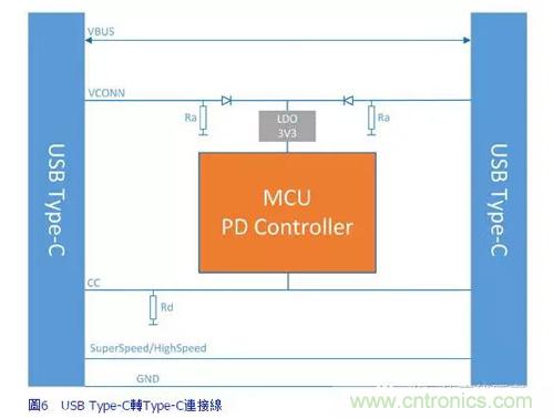 在這些情況下,Dongle成為兩個裝置間功率協商的一部分,要求連接線或Dongles具有嵌入式PD控制器。PD控制器最初是透過設定為5V的Vbus或是Vconn線路供電,接下來會與主機協商,就Vbus線路中的電源功率達成一致意見。圖6顯示電子標記的連接線組件,或EMCA范例,將兩個Type-C裝置連接在一起。PD控制器的電源可由Vconn1或Vconn2提供。EMCA會通知其在CC線路上的最大功率容量,電源則會作出相應調整。