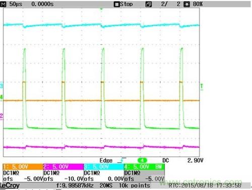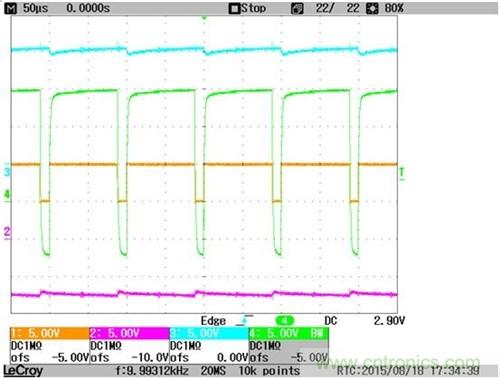 選取高占空比和低占空比兩個工況,觀察相關信號的波形,見圖4和圖5。其中橙色的1通道顯示低壓側驅動輸入信號,粉色2通道顯示-8V電源輸出端的波形,藍色3通道顯示+15V電源輸出端波形,綠色4通道顯示門極輸出波形。